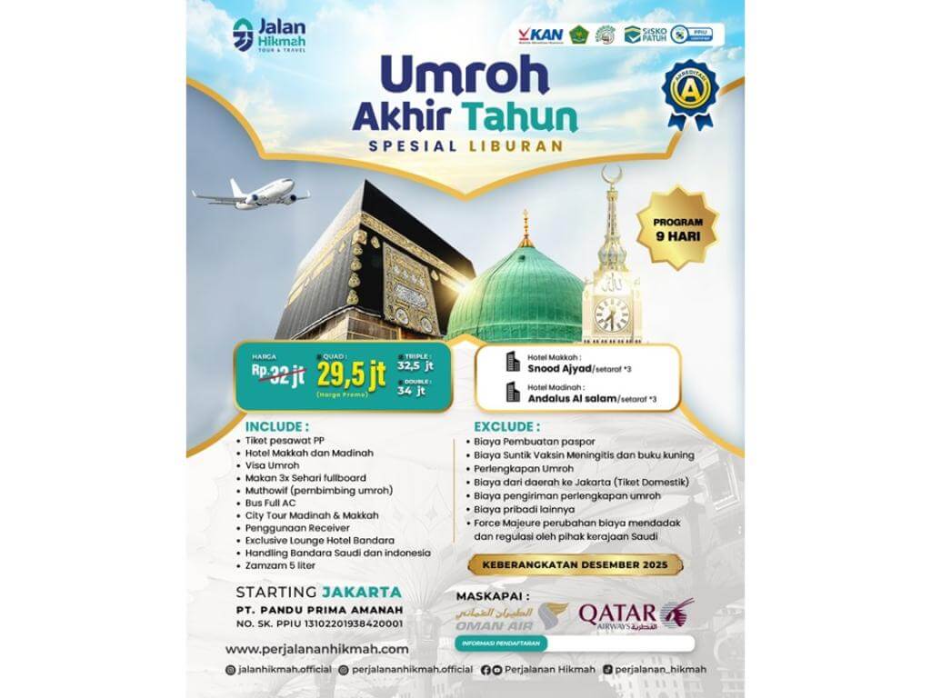 Telah Memenuhi syarat untuk melakukan perjalanan ibadah umroh / haji, Seperti : Melakukan Vaksinasi Covid - 19 Dosis Lengkap vaksin dosis 1, dosis 2 dan Booster 1. Maksimal 20 hari sebelum keberangkatan, vaksin meningitis beserta buku kuning atau e sertifikat dan melakukan vaksin polio serta Terdaftar sebagai peserta BPJS Kesehatan RI dan Menerima Ketentuan Force majeure Perubahan Biaya yang bisa berubah sewaktu-waktu dan perubahan regulasi dari pihak kerajaan Saudi (akan dikonfirmasi sebelum keberangkatan)